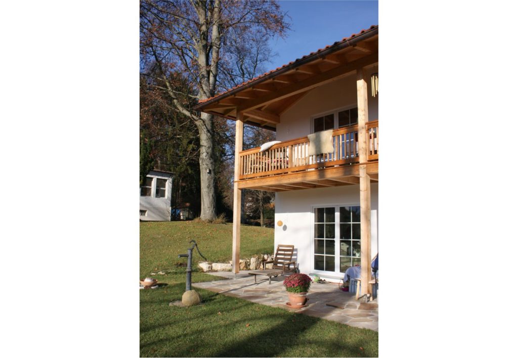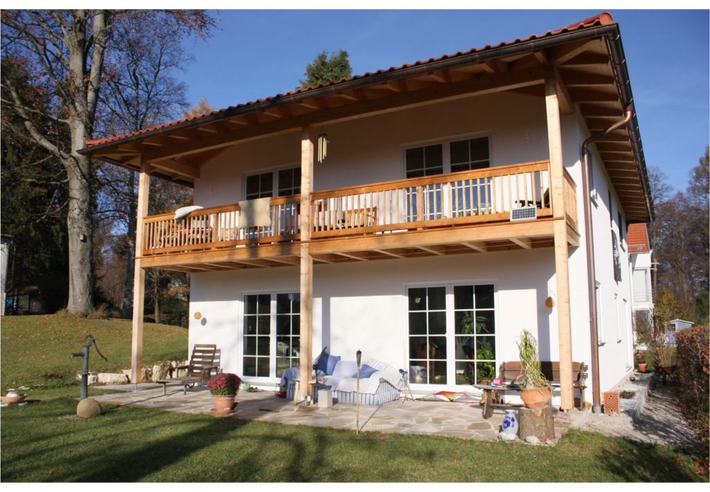 Hier deutet nichts darauf hin, dass sich unter der Fassade ein echtes ökologisches Holzhaus mit hohem Wärmeschutz und atmungsaktiven‚ warmen Außenwänden verbirgt. Die gelungene Materialkomposition aus feinem Holz, Mineralputz und Glas wirkt sehr harmonisch und ansprechend. Im Inneren dominiert der großzügige Wohn-Essbereich mit Zugängen zu den Terrassen. Große Glasflächen verwöhnen mit viel natürlichem Licht. Seinen ganz besonderen Reiz hat das elegante Walmdach, unter dem eine spürbare Leichtigkeit des Raumes entsteht, nicht zuletzt durch die optimale Raumplanung und Ausnutzung der vollen Wandhöhen im Obergeschoss.